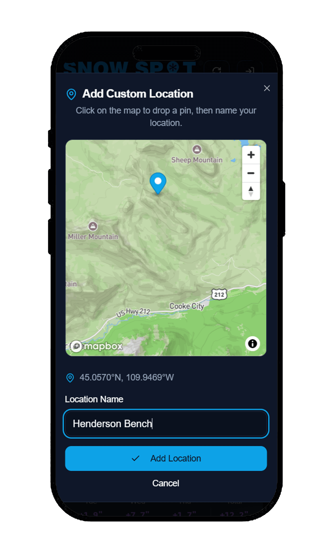 Drop a pin anywhere—backcountry zones, sidecountry stashes, or your favorite resort.