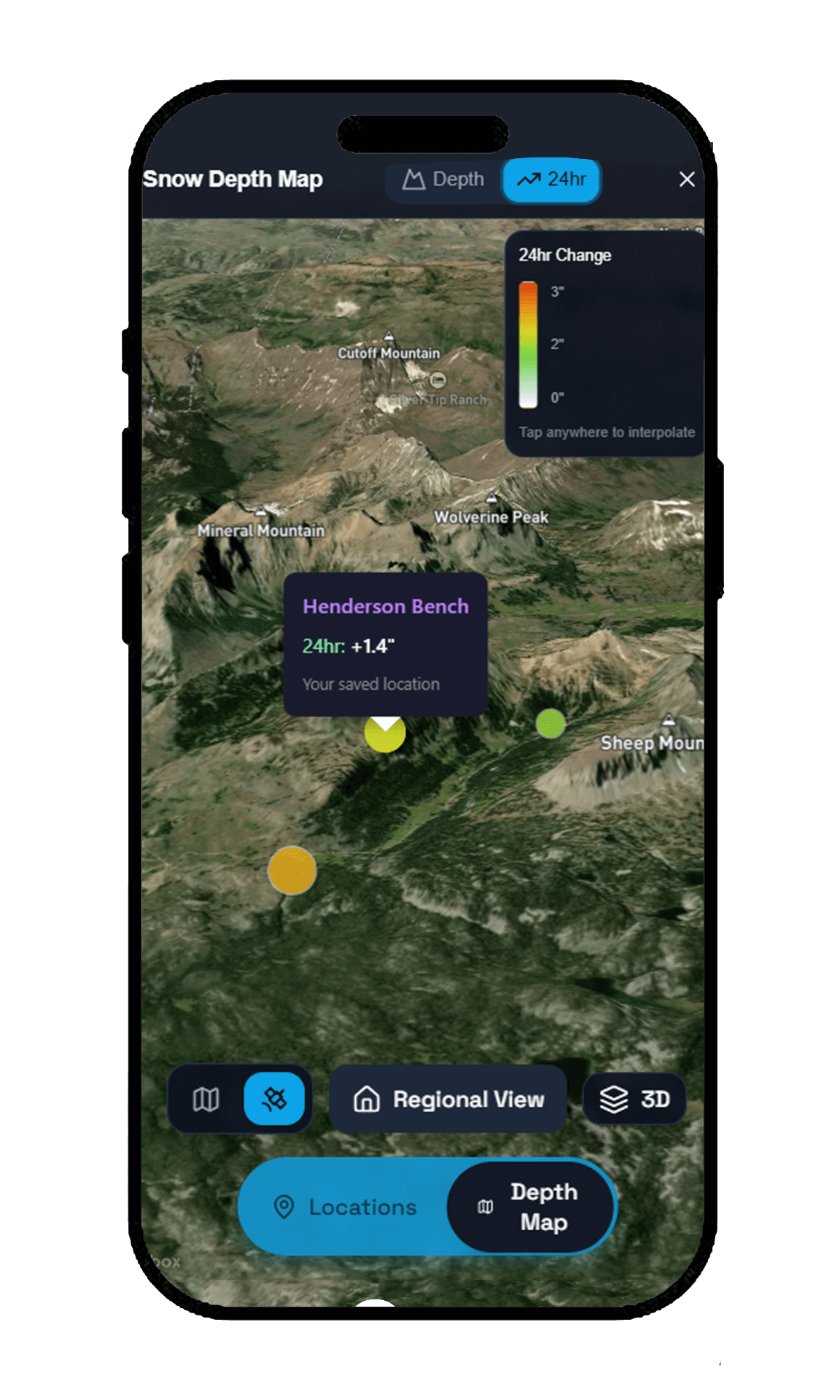 Explore snow conditions in stunning 3D terrain. Visualize depth and 24hr changes across the mountains with SnowSpot's interactive mapping tool.